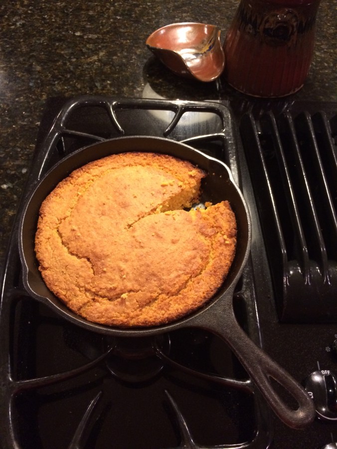 All made from scratch with organic whole wheat and organic all purpose flour (1/2 and 1/2 so as not to be too dense š )…and the cornbread is made from organic whole wheat pastry flour and coarse corn meal. I did learn a little about coarse cornmeal: it makes your cornbread quite crunchy! Haha.