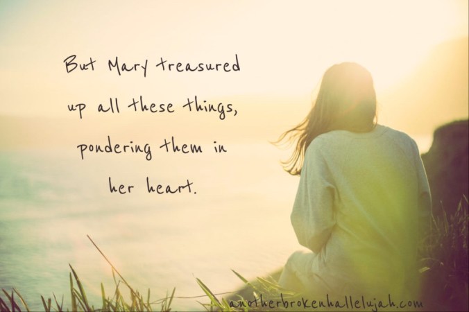 It makes me think of the scripture spoken of the mother of Jesus, “But Mary kept all these things and pondered them in her heart.” (Luke 2:19) I am by no means aligning myself with Mary, as she was much more meek, humble and chosen. Yet, I think of how she might have pondered all the wonderful things about Christ, even from his birth, and I aspire to be like that. She seems to be a woman who pondered and mused the things that happened to her, to her family and to her children. She seemed to be a woman of deep thought, possibly even, a woman of few words. Taking things as they come, adjusting as she must, and living life with faith and strength through the good and the bad.