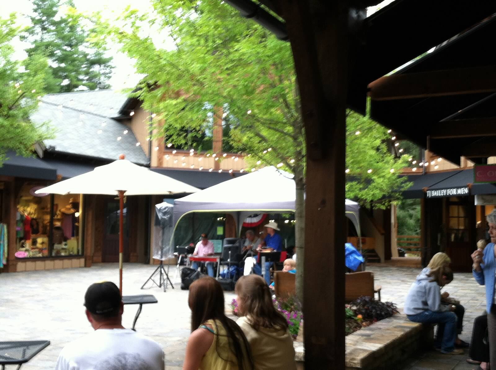 It’s not a big city. It’s a quaint little mountain town with a little bit of “high society” living. They’ve got wonderful accommodations, restaurants and shops. One of my favorites is The Old Edwards Inn; the character of this place is incredible. They have a library, in which, you can actually find a book to sit and enjoy, high vaulted ceilings and even a hidden butler pantry where the staff may come to serve the guests. Their restaurant, Madison’s, has some of the best shrimp and grits I’ve ever put in my mouth…and being a Southern girl, that’s quite a bit! They have inside seating, a wine garden with outside seating, and even a rooftop terrace where you can choose to have your meal.   Now just imagine: a lovely rooftop terrace, with beautiful shutters, table settings and cushioned seating, overlooking the little town, and a gentle summer breeze blowing in the “heat” of summer with ceiling fans gently rolling. The temperature gauge rising no more than about 70-72 degrees, because you’re at such a high elevation! The waiter brings you a pleasant cheese and cracker tray for an appetizer, “just right” sweet Southern tea, mini biscuits and cornbread made fresh daily, and your meal consists of fish and chips and the best shrimp and grits you’ve ever tasted. They even serve the shrimp and grits in a mini iron crock; so, they stay warm throughout the duration of the meal. It is a fine Southern meal to remember! 😉